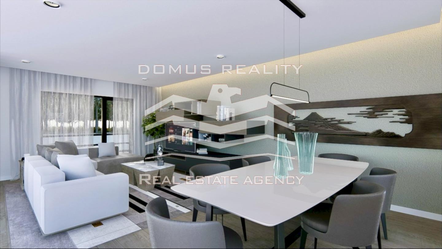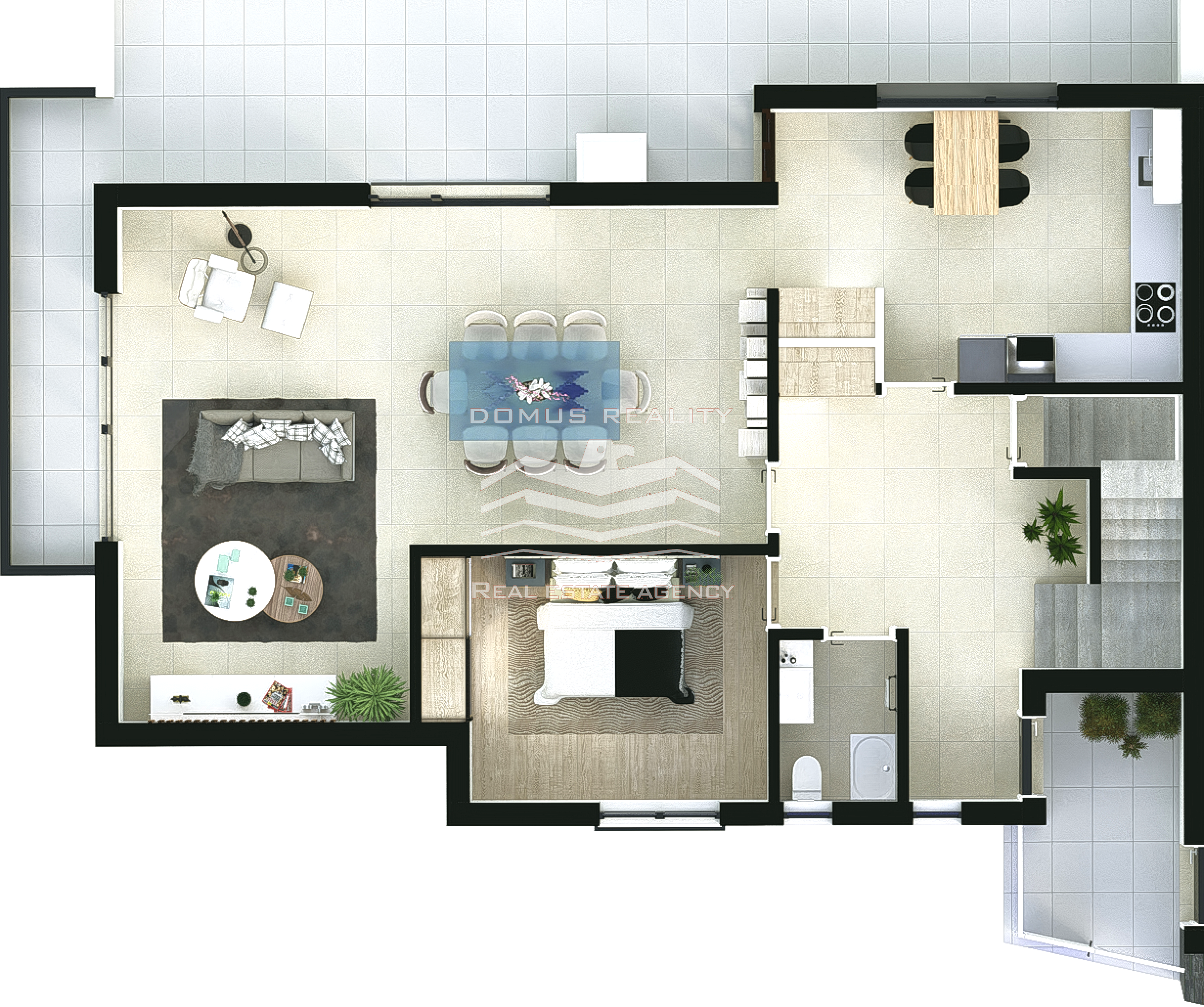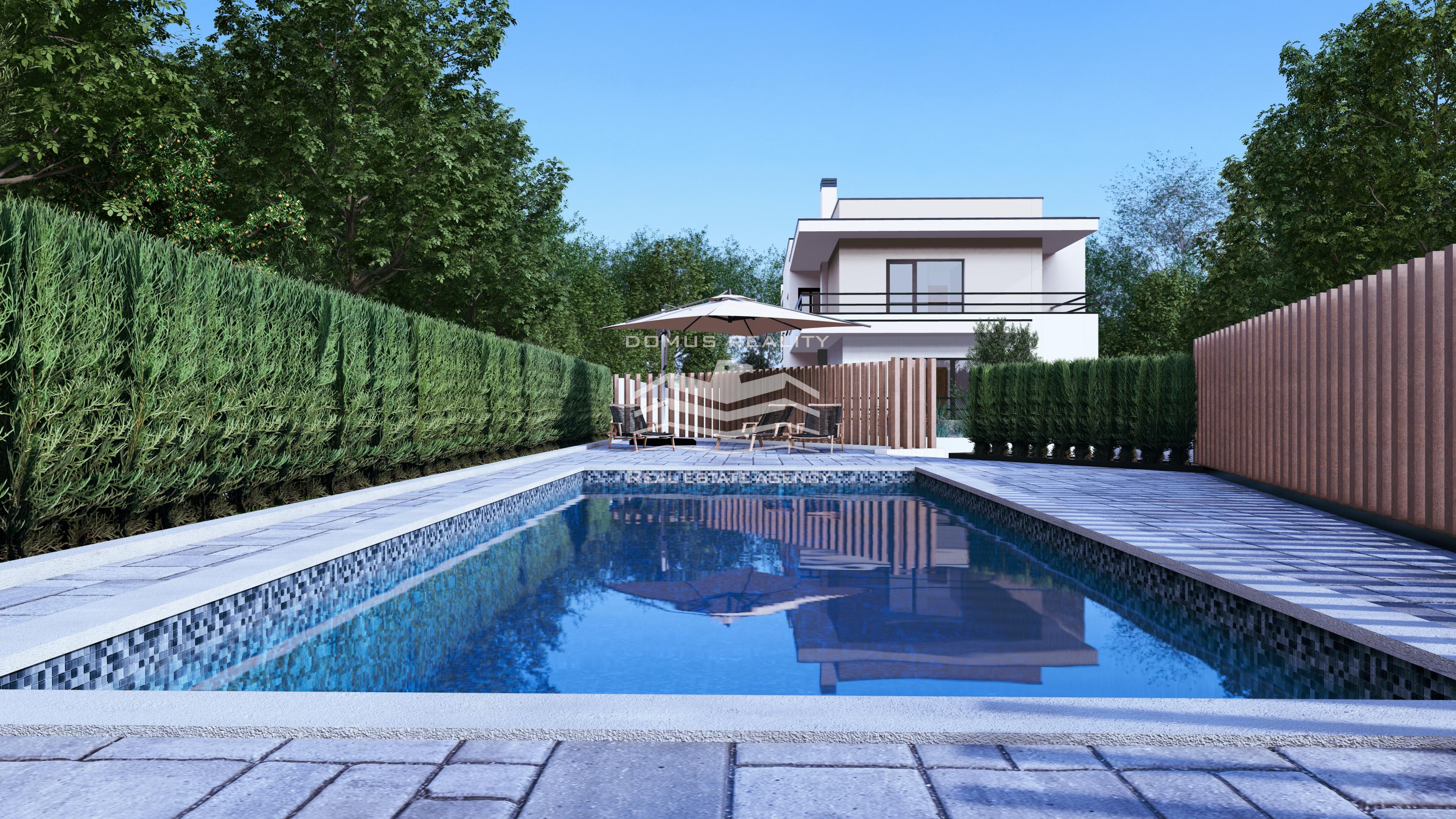 Venkovní prostory byly navrženy se stejným důrazem na prostor: velká terasa s grilem, dvojgaráž a prádelna v suterénu.