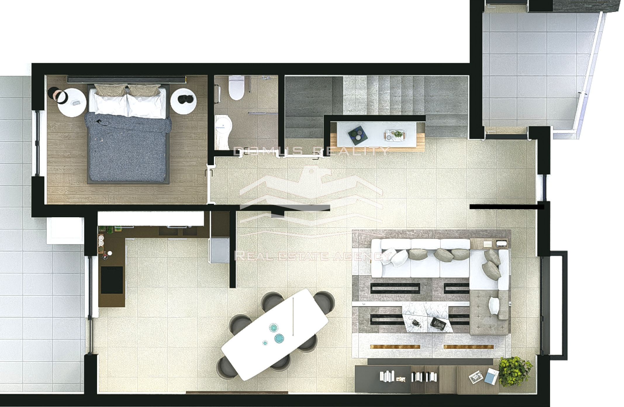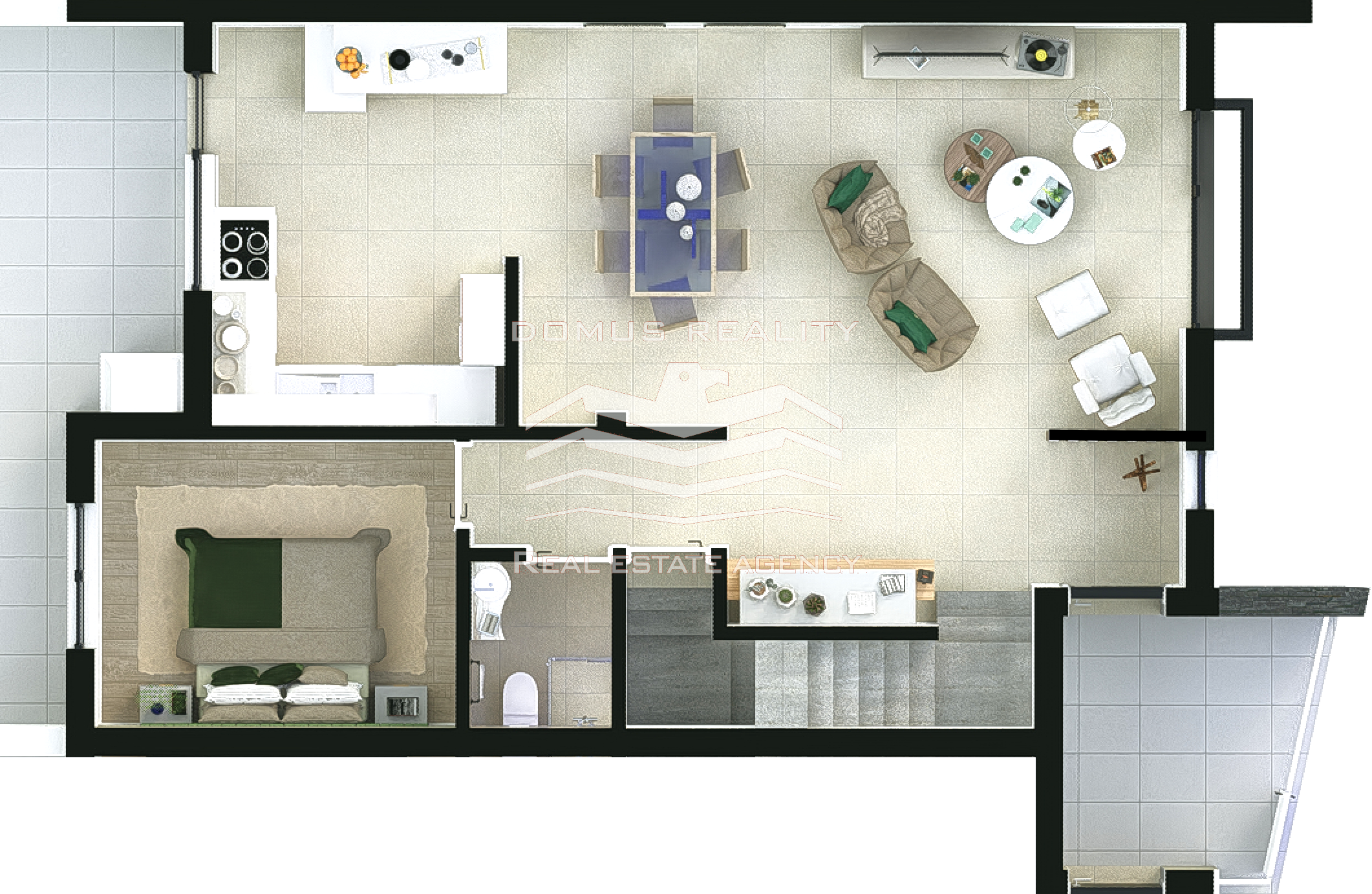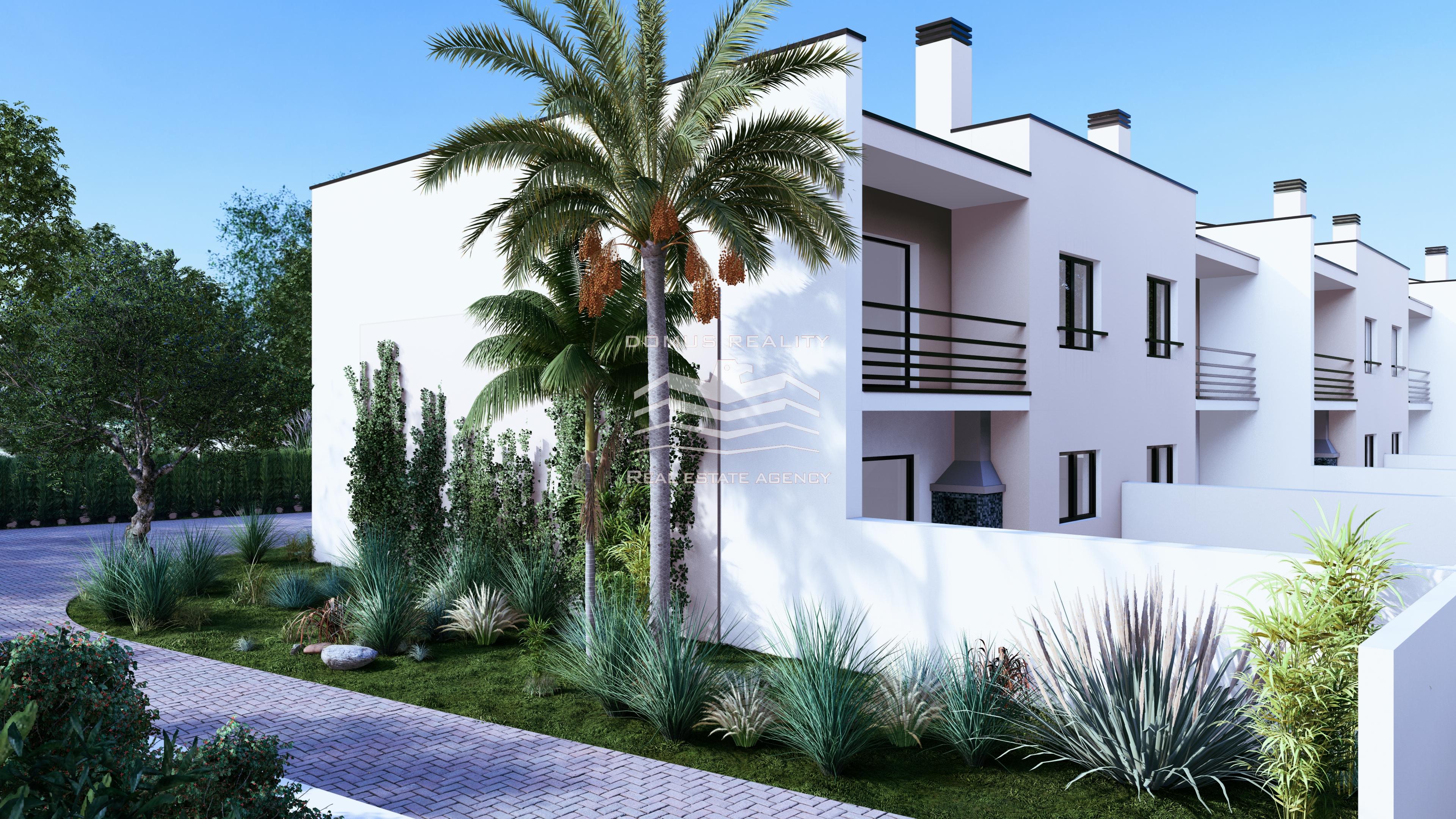 V přízemí každá vila zahrnuje prostorný dvojitý obývací pokoj zalitý světlem, který navazuje na velkou kuchyni, jednu ložnici a koupelnu se sprchovým koutem. První patro se skládá z hlavní ložnice (se sprchovým koutem a šatnou), dvou dalších ložnic (každá se šatnou) a druhé koupelny se sprchovým koutem. Dvojitý obývací pokoj a kuchyně vedou na jižní terasu. Hlavní ložnice a velká ložnice v patře mají každá svou vlastní terasu.