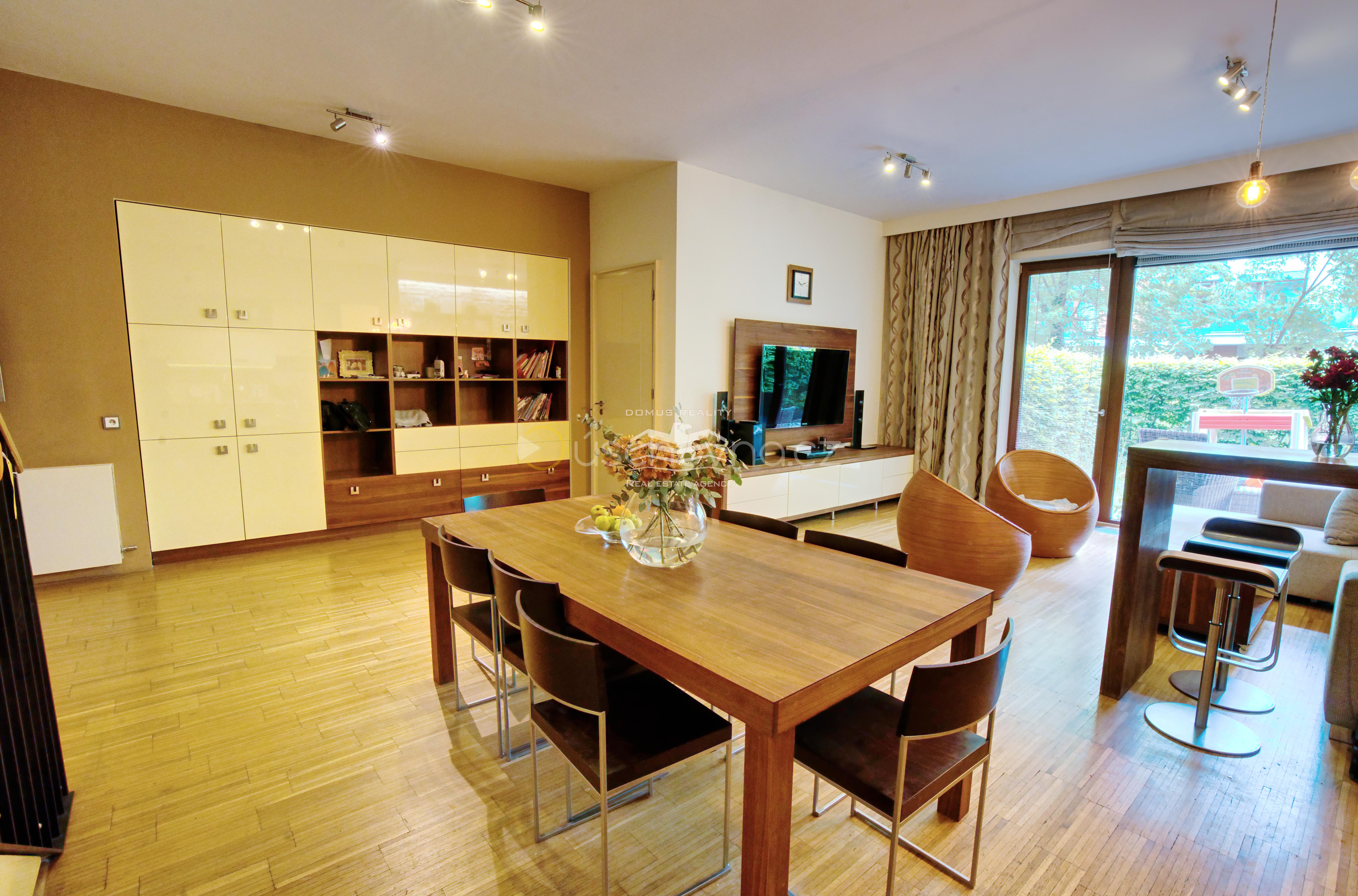 Vstupním bodem je prostorný obývací pokoj s kuchyňskou linkou, který nabízí přímý vstup na terasu a výhledem do parku. Obě ložnice mají také přístup na terasu. Hlavní ložnice disponuje vlastní šatnou a koupelnou se sprchovým koutem. K dispozici jsou celkem dvě koupelny, technická místnost, dva sklepy a zmíněné dvě garážová stání.
