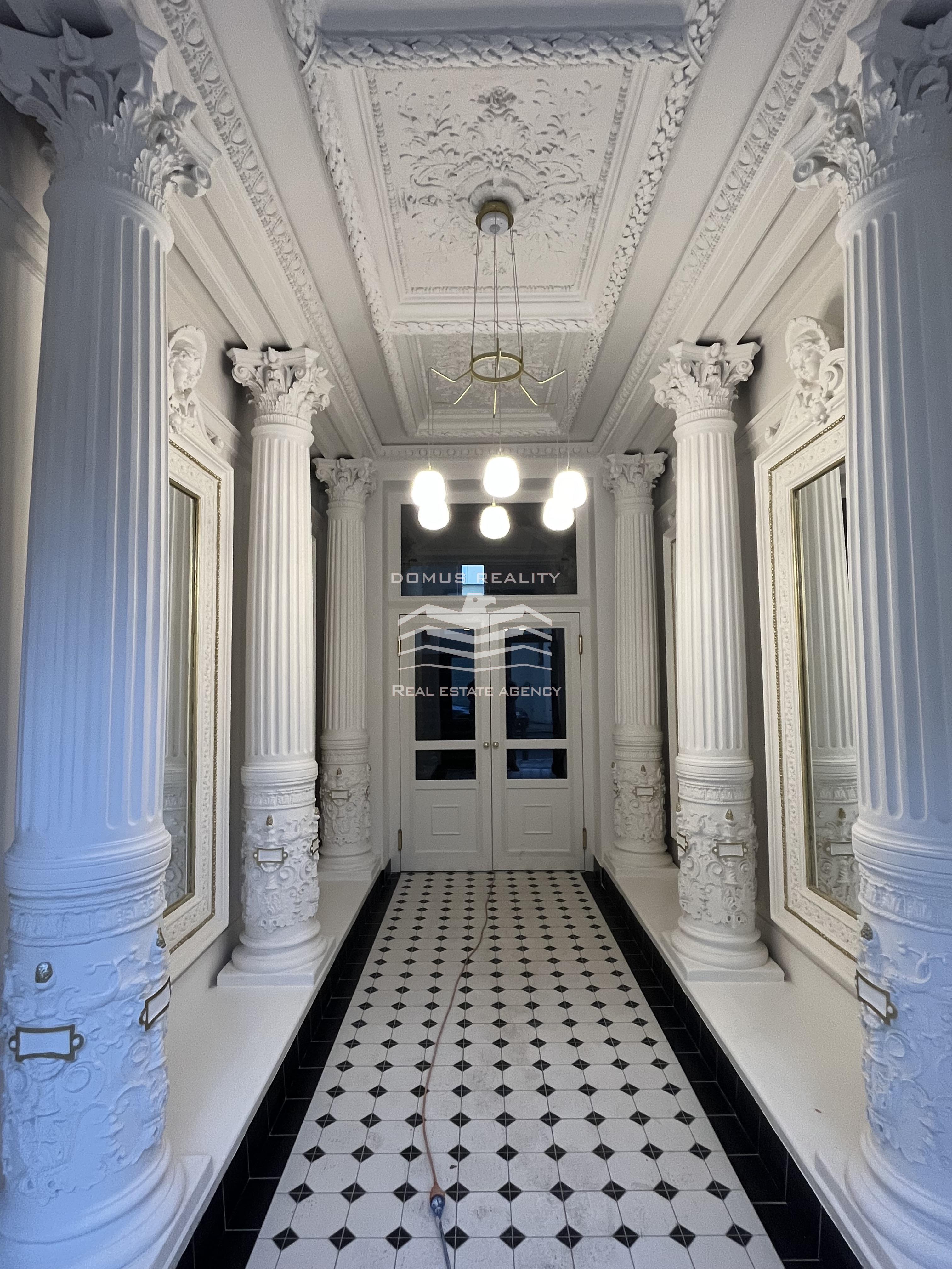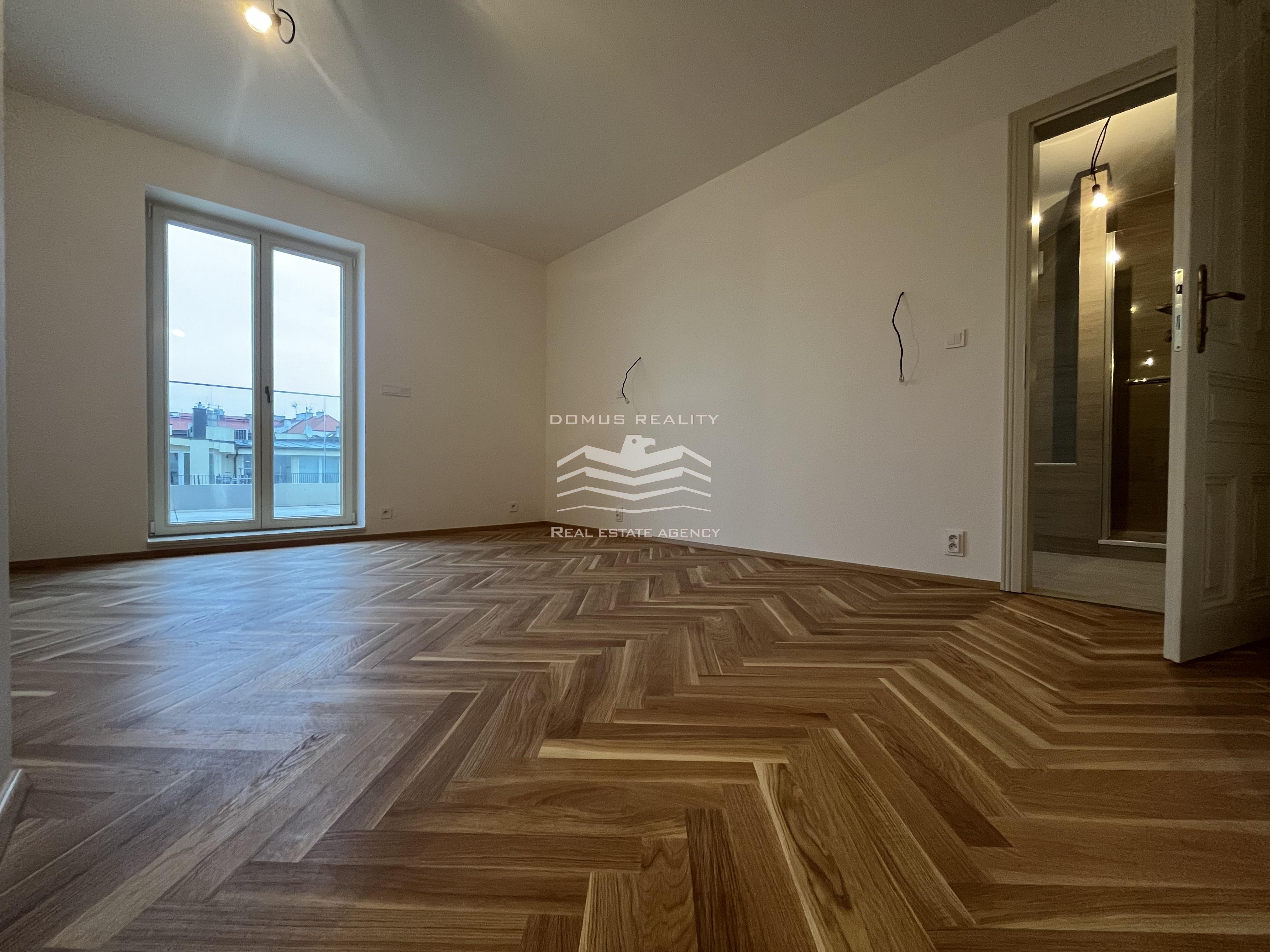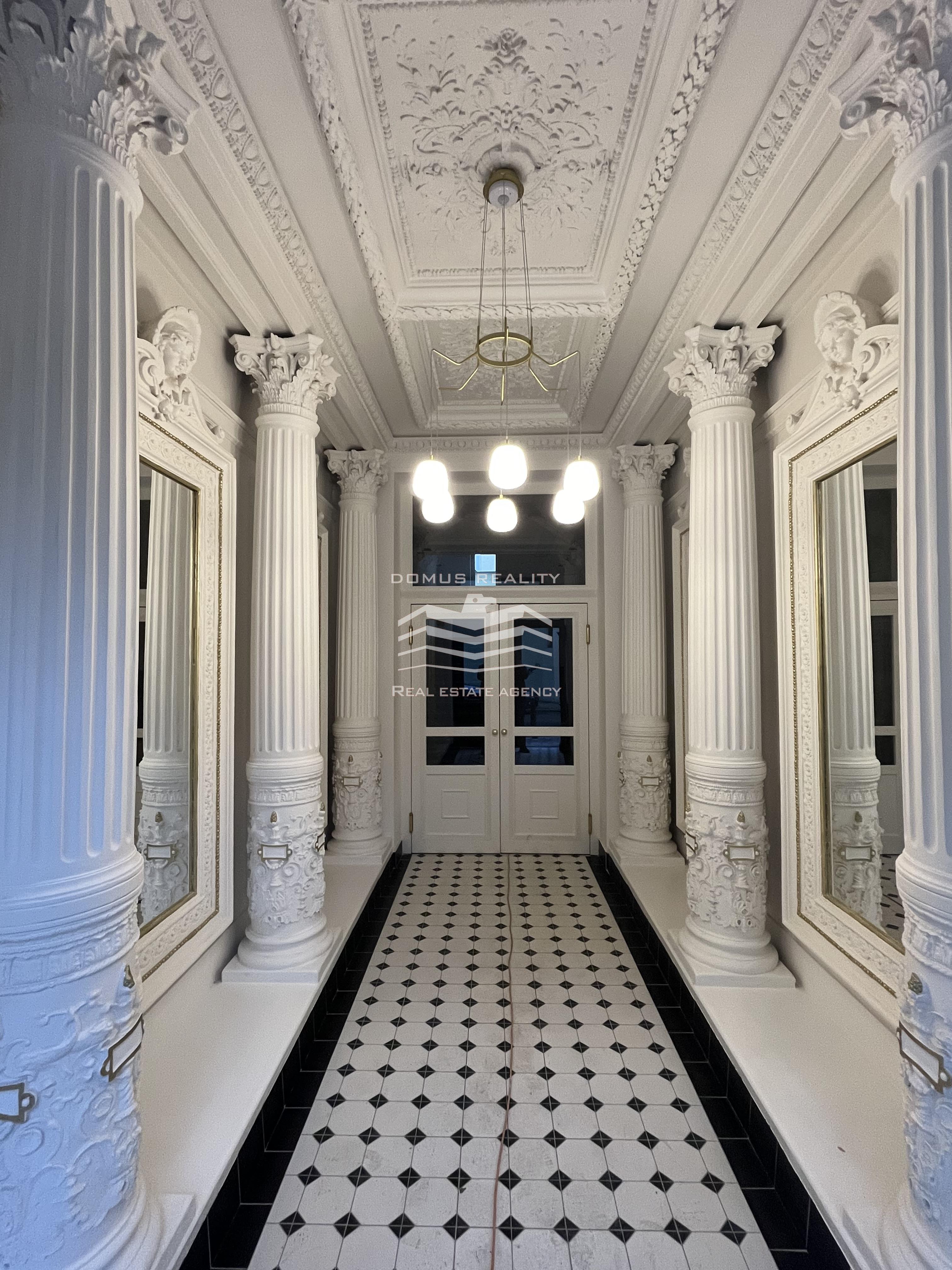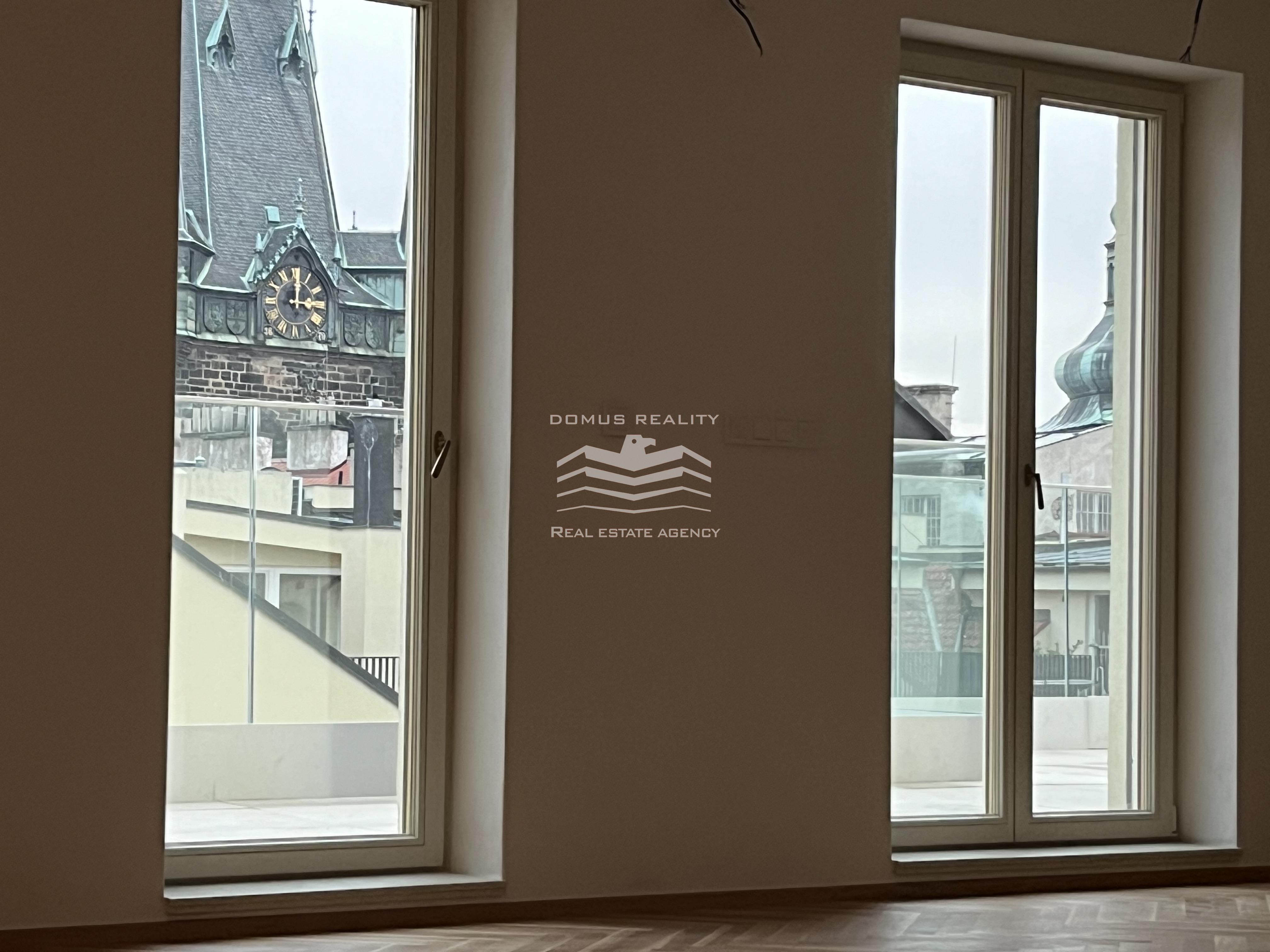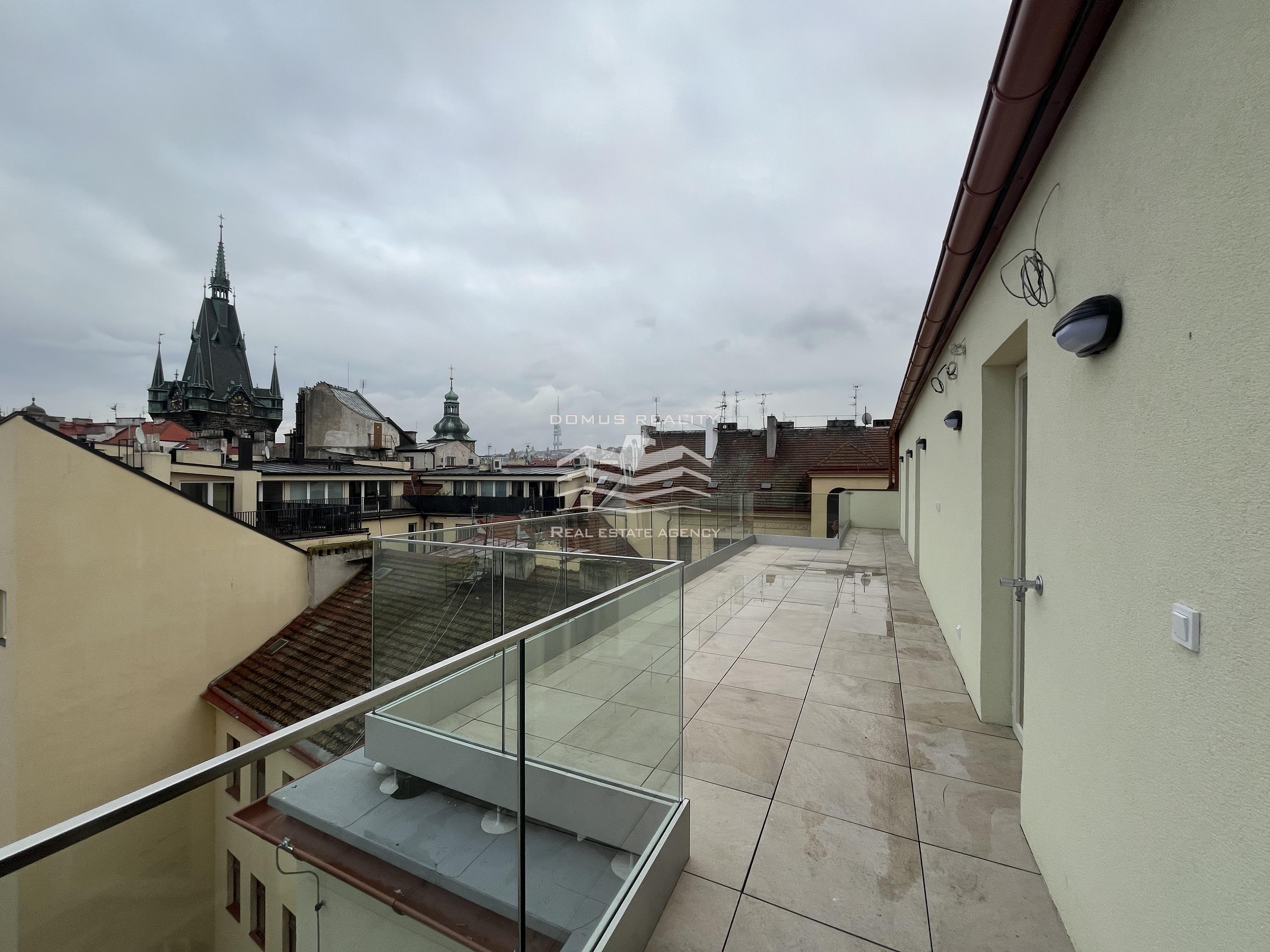 Nový rozlehlý a klimatizovaný byt s vlastní terasou se rozkládá po celém posledním patře v kompletně zrekonstruovaném domě s výtahem. Byt se nachází v boční ulici u pěší zóny Na Příkopě a u Václavského náměstí. Byt v sedmém patře je tvořen prostorným obývacím pokojem a přípravou na kuchyni (celkem 76 m2), hlavní ložnicí s vlastní koupelnou (možnost vestavění sauny), dalšími dvěmi menšími ložnicemi, samostatnou toaletou, koupelnou, technickou místností, chodbou a vstupní halou s přímým vstupem do výtahu. Při rekonstrukci domu byly vyměněny parkety, vstupní dveře, střešní okna a eurookna (do dvorního traktu). Bylo pořízeno elektronické podlahové vytápění (Heatflow), nové zařízení koupelny (Villeroy & Boch) a klimatizace (Daikin). K bytu také přísluší sklep.