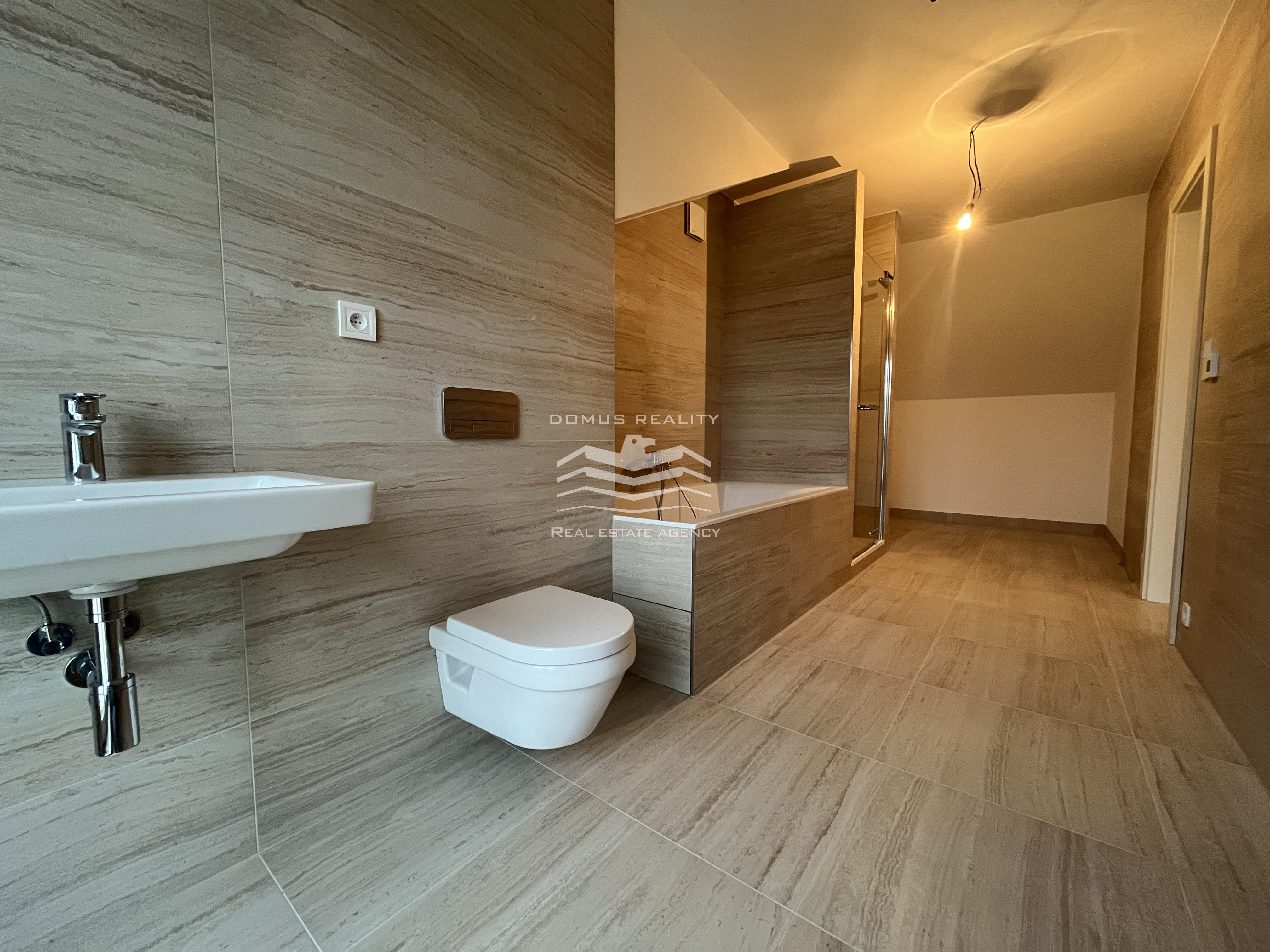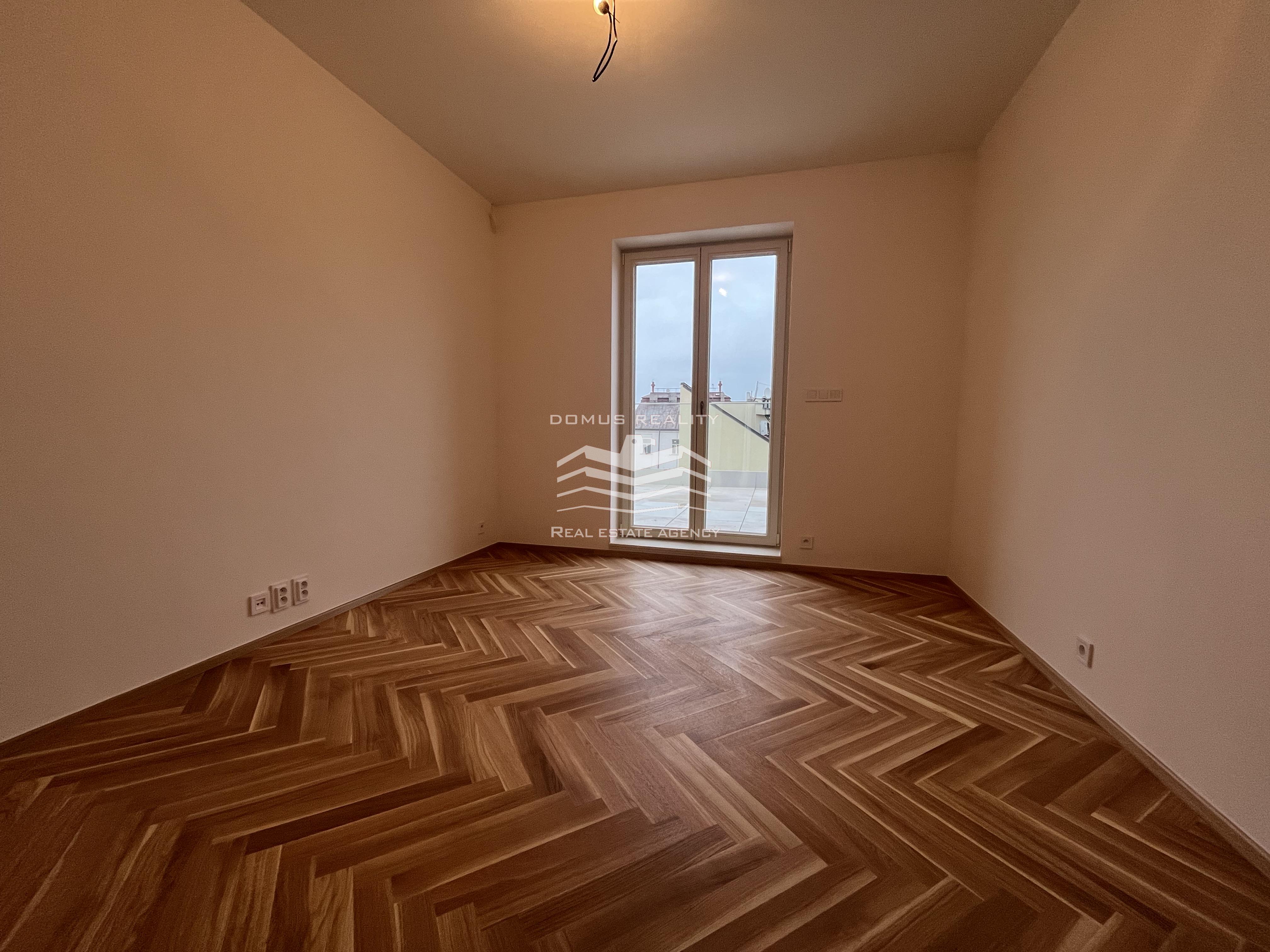 Nový rozlehlý a klimatizovaný byt s vlastní terasou se rozkládá po celém posledním patře.