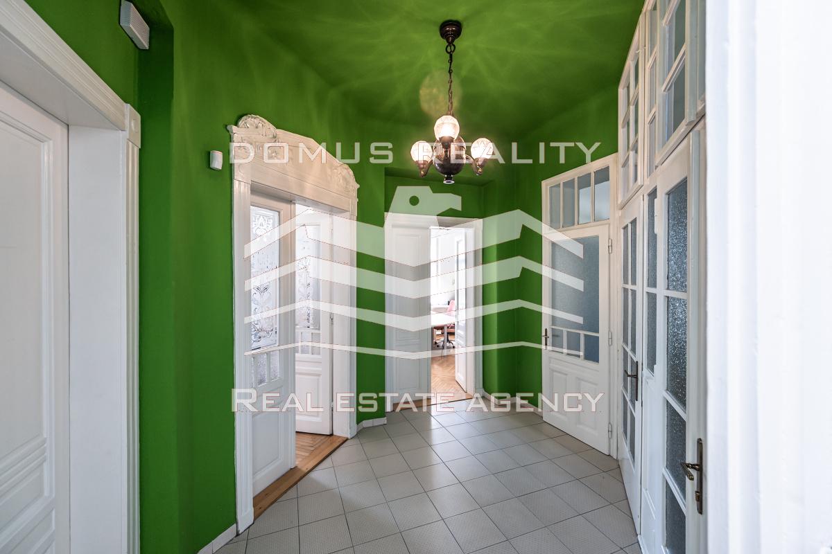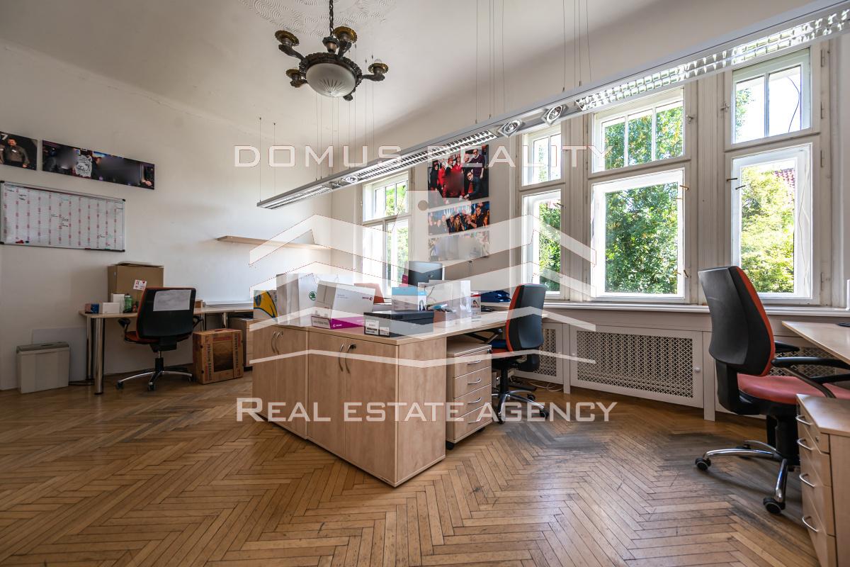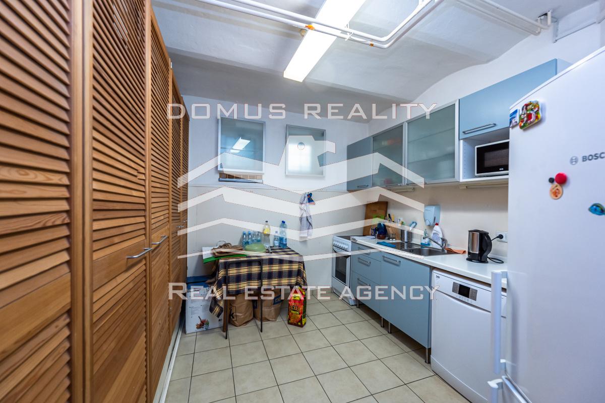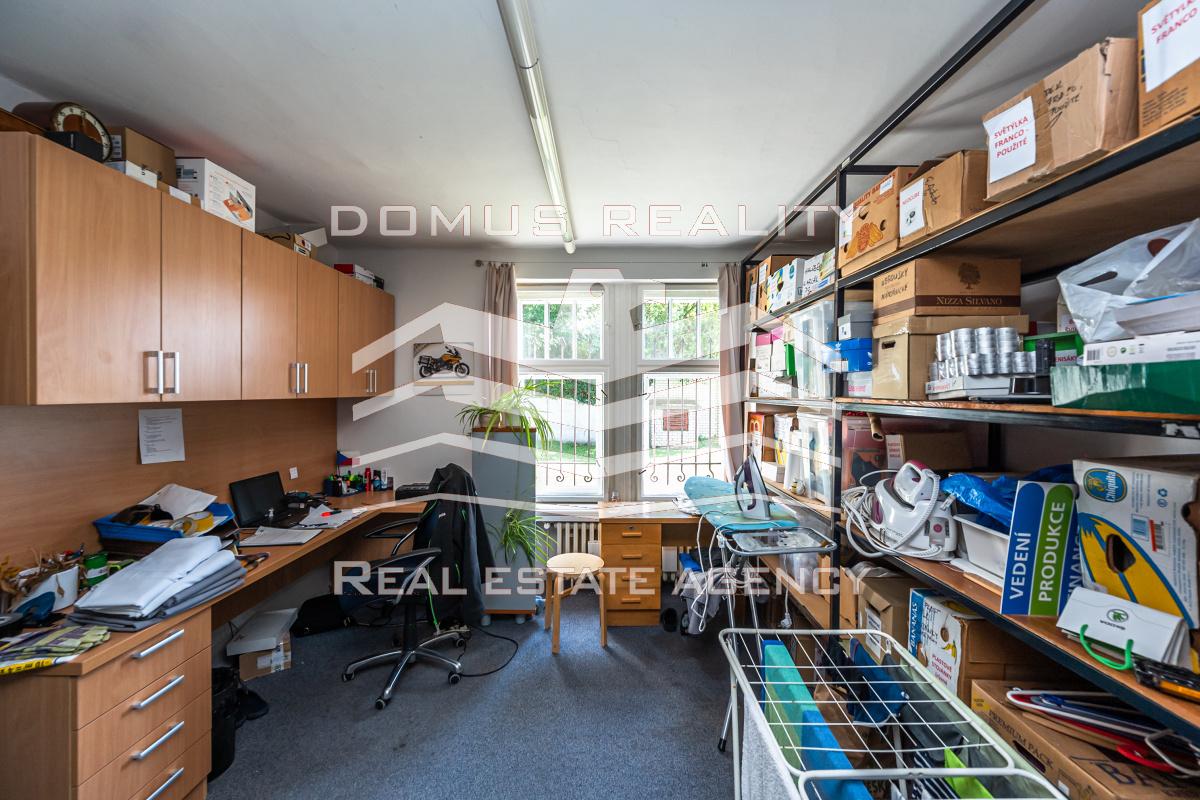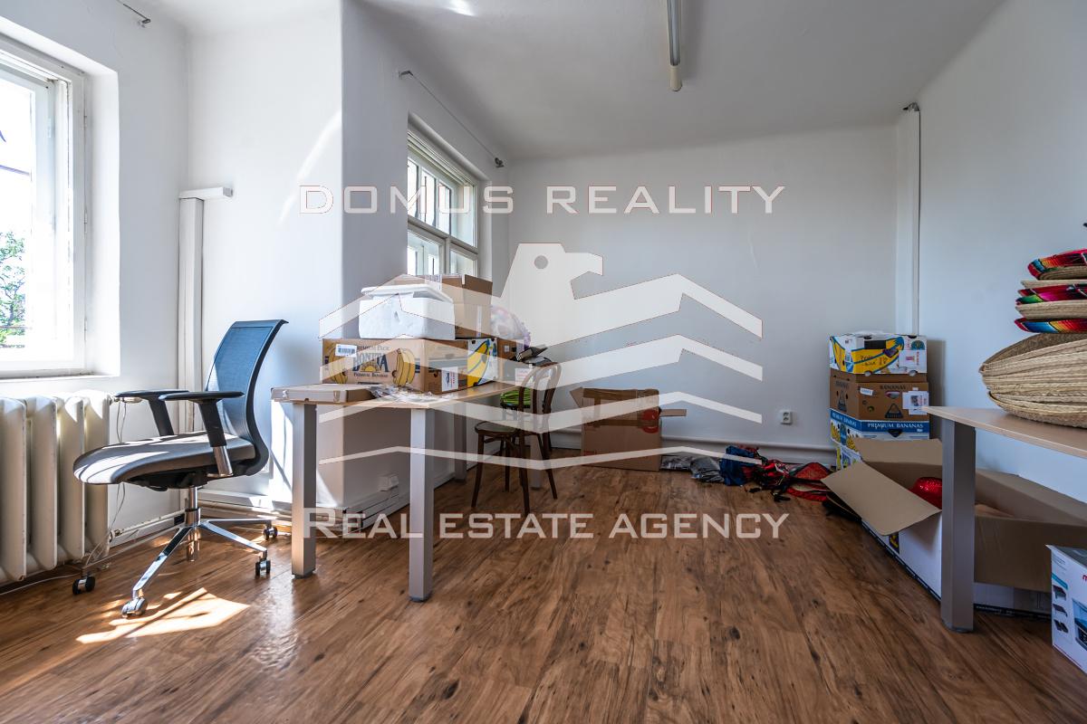 Přízemní kanceláře cca 120m2, tj. tři místnosti, kuchyňka, WC a koupelna.