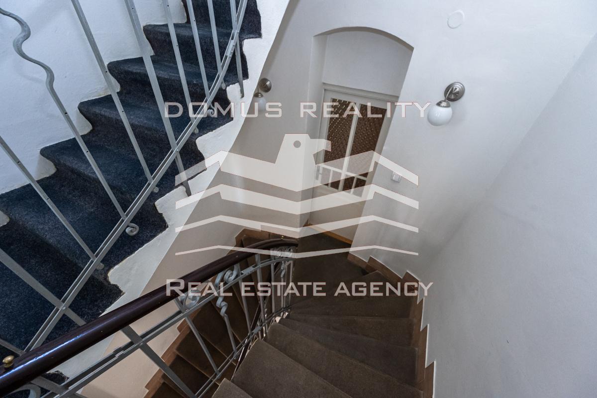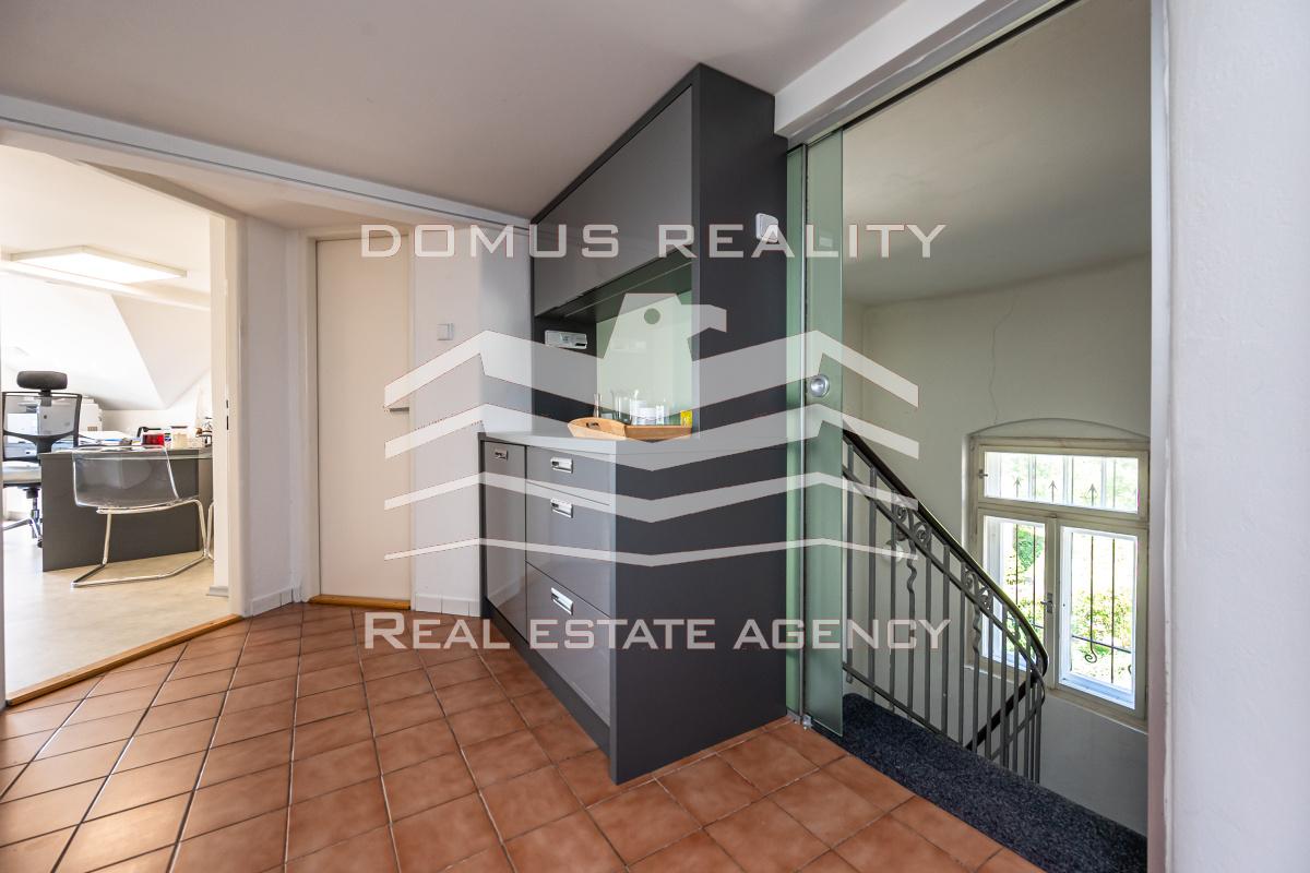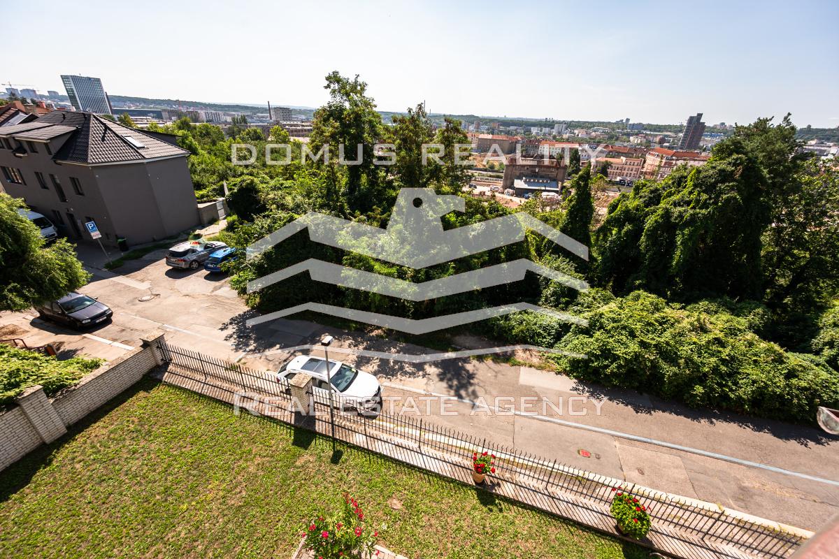 Druhé patro slouží jako kompletně vybavený byt s klimatizací a nádherným výhledem na Prahu.
