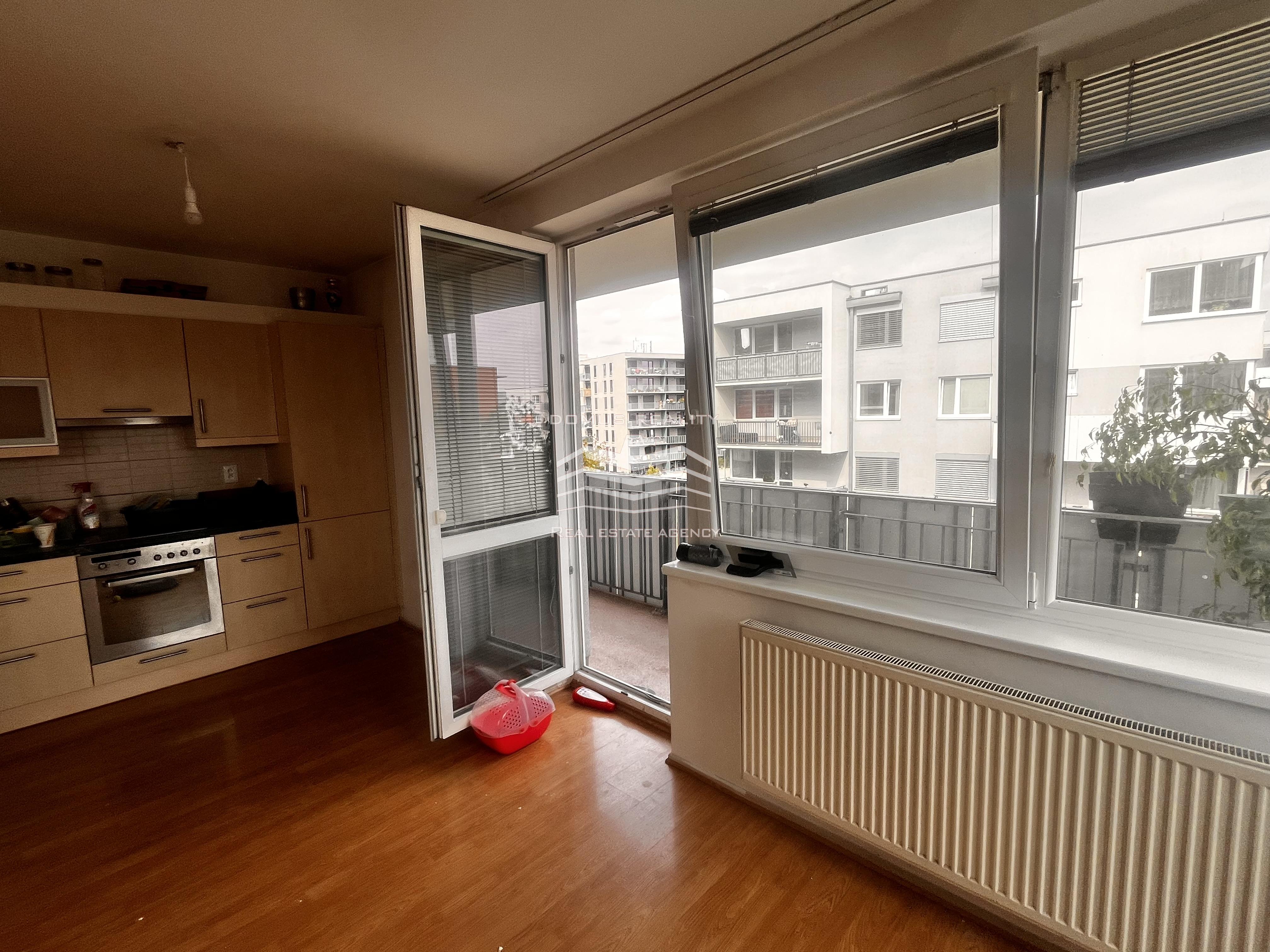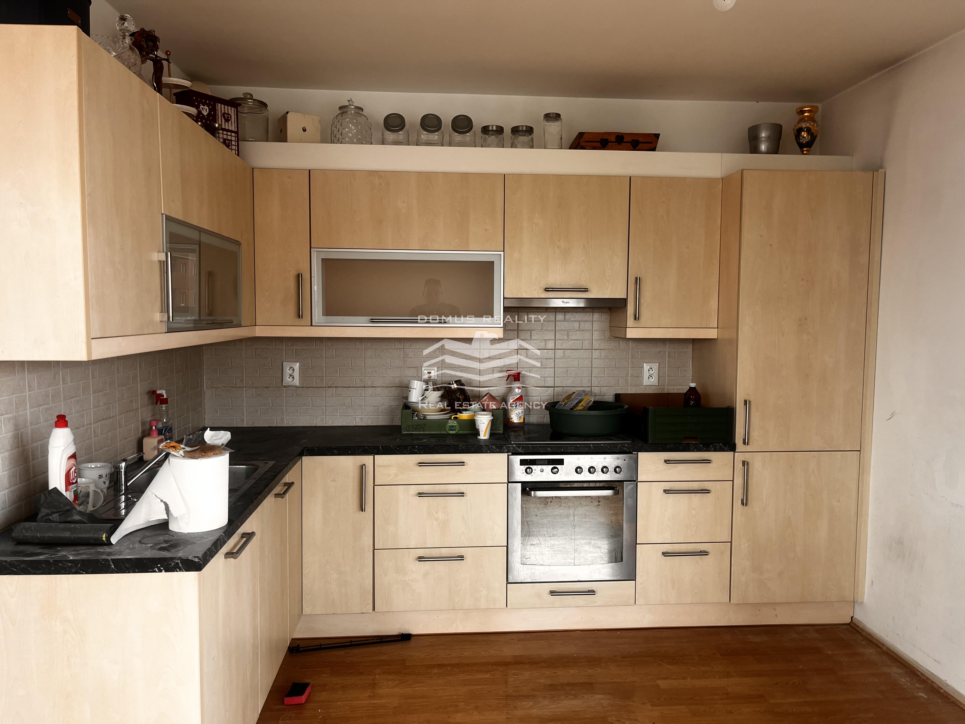 Na míru vyrobená kuchyň je osazena kvalitními vestavěnými spotřebiči: 60cm myčkou nádobí, elektrickou troubou, varnou deskou s digestoří a lednicí s mrazákem. Nabízí dostatek úložných prostor i pracovní plochy. Balkon poskytuje příjemné místo pro venkovní posezení.