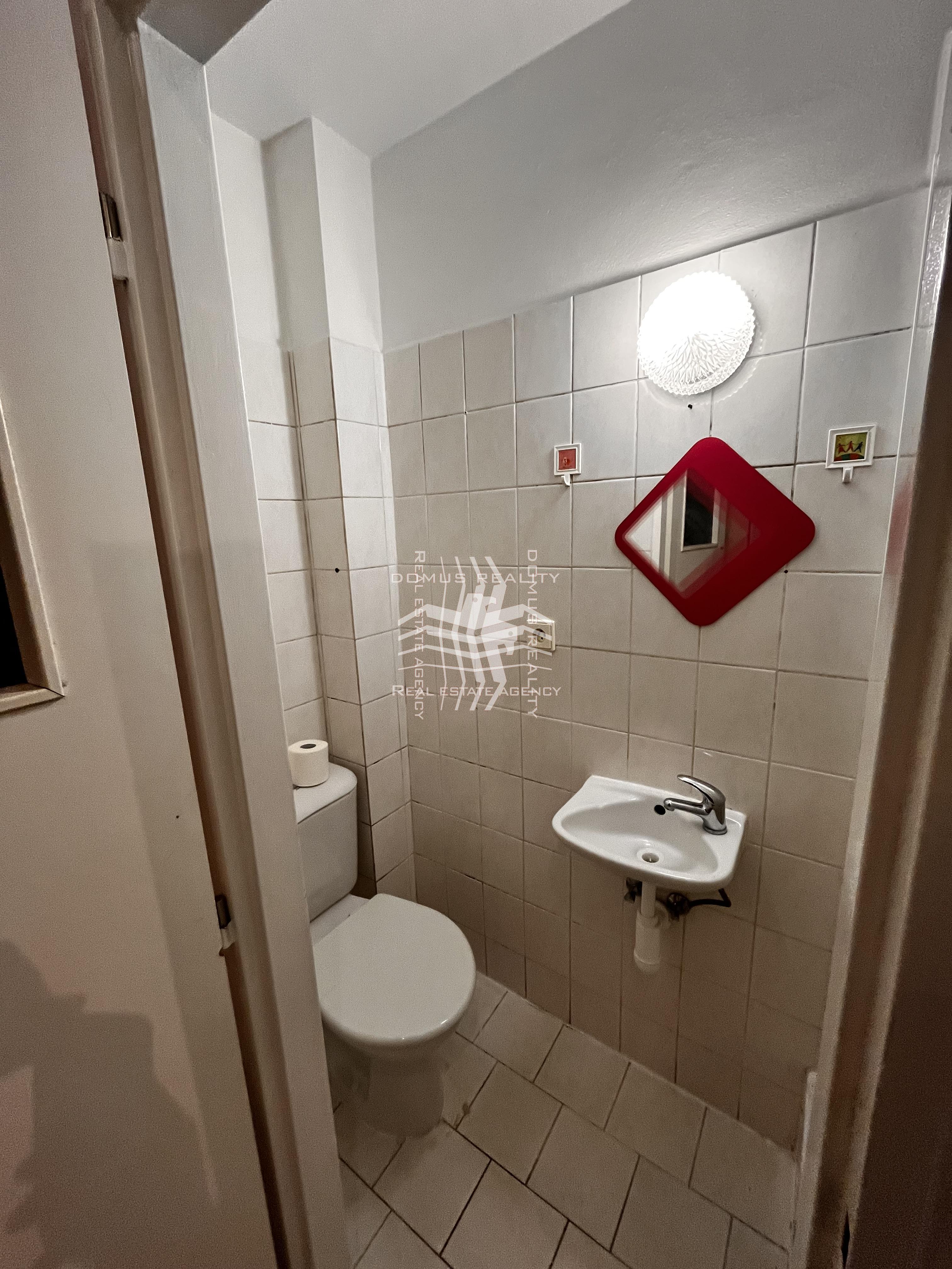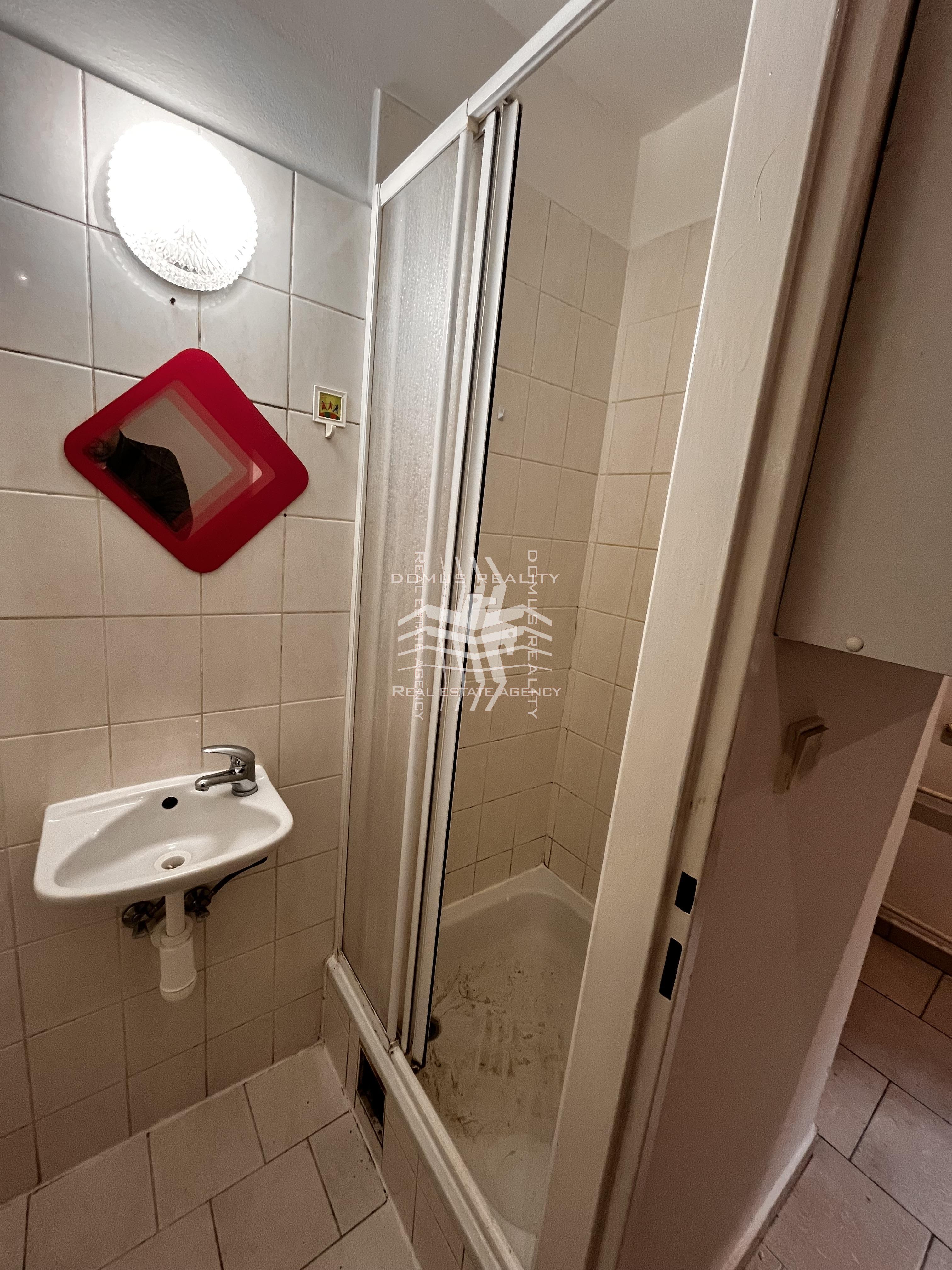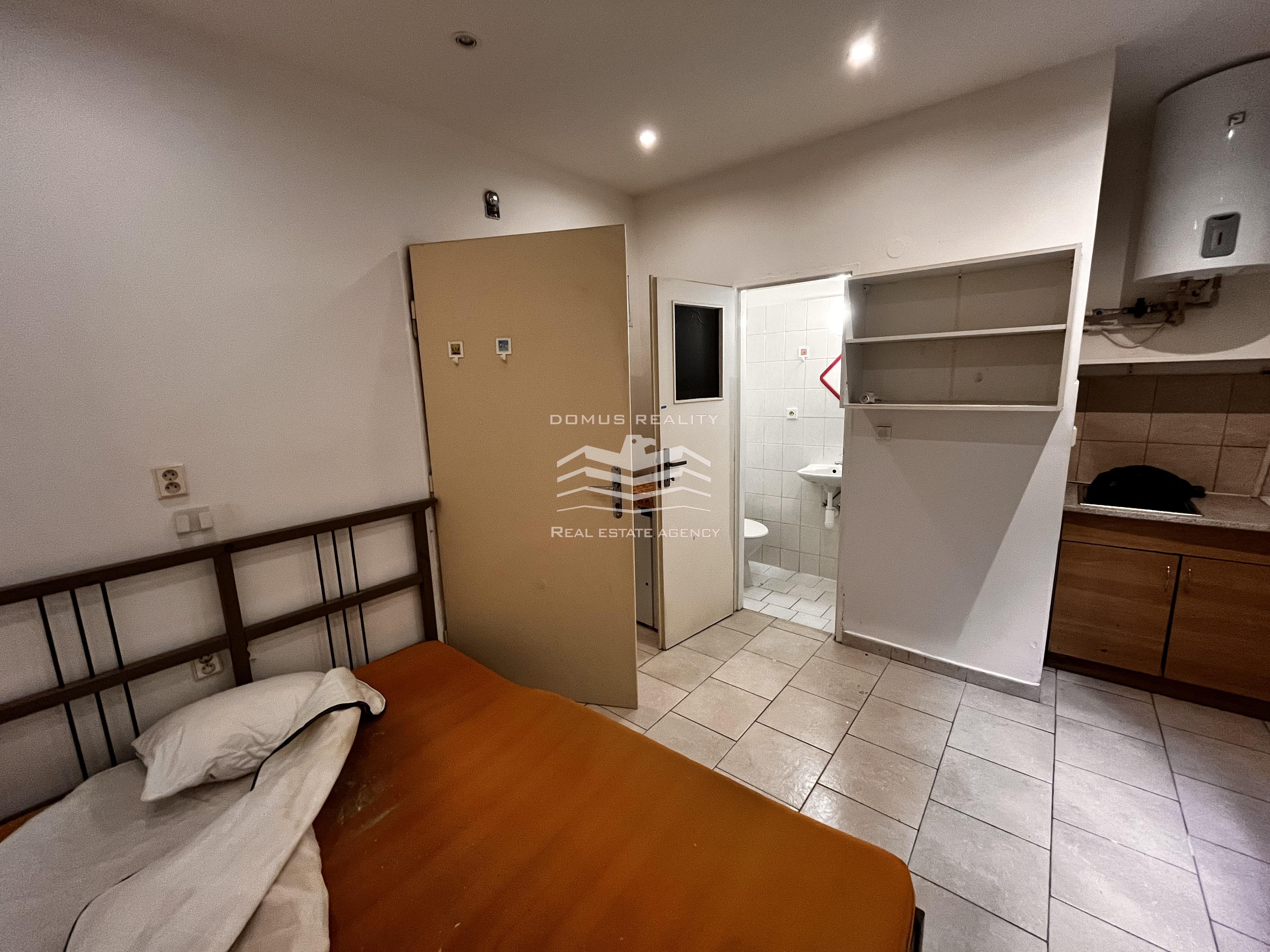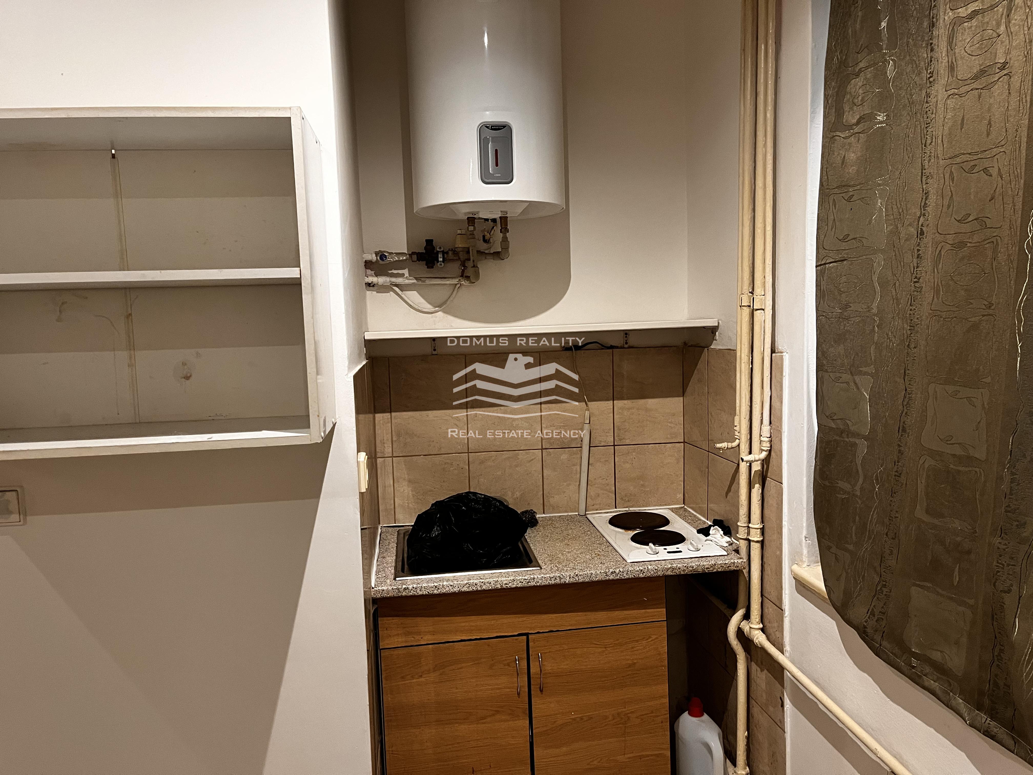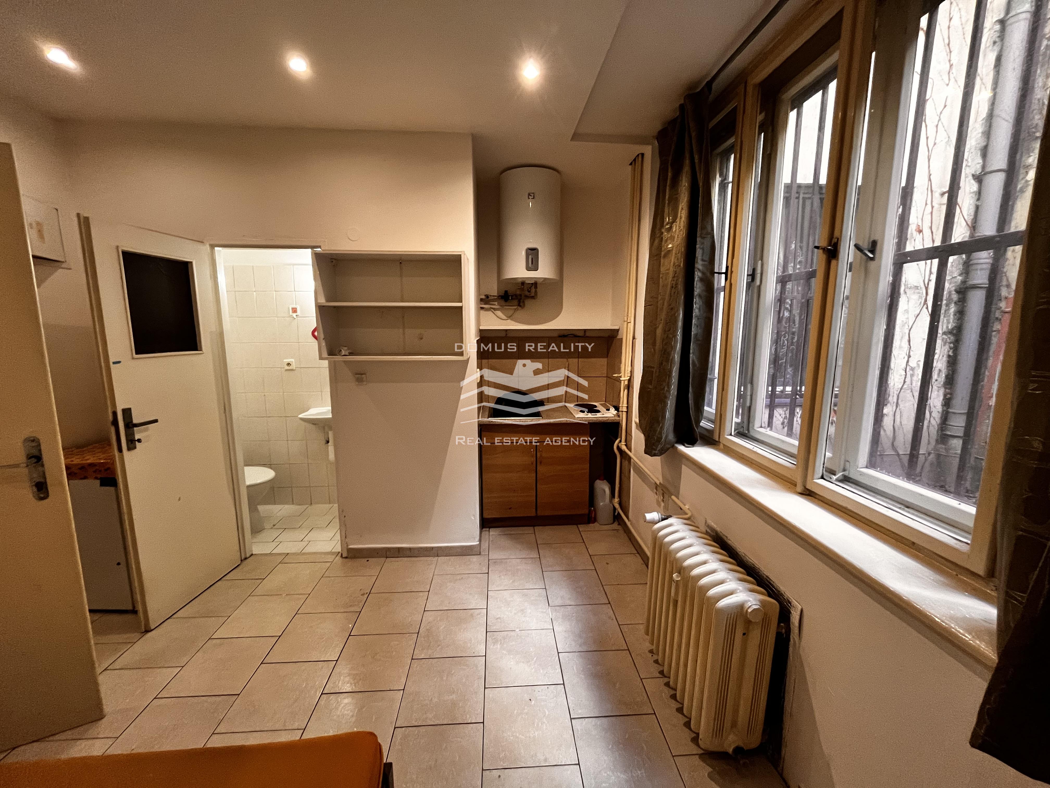 Byt se nachází v suterénu cihlového domu s výhledem do malého dvorku. V bytě je k dispozici malá kuchyňská linka a elektrický sporák. Koupelna je vybavena sprchovým koutem, bojlerem a toaletou.